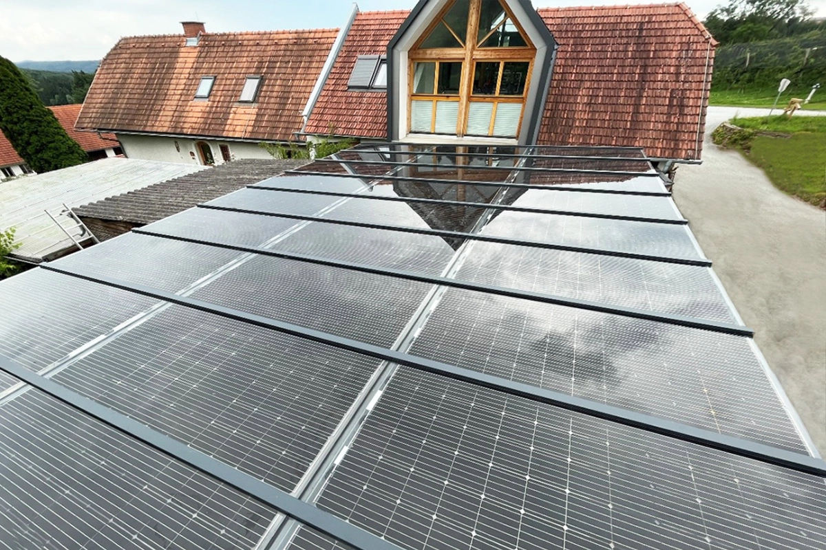 Ein Carport-Dach im stilvollen Design, das Photovoltaik nahtlos integriert. So elegant kann eine Überdachung sein: Ausgestattet mit hochwertigen Glas-Glas-Photovoltaikmodulen eines österreichischen Herstellers, schützt diese Überdachung nicht nur Fahrzeuge, sondern erzeugt gleichzeitig umweltfreundlichen Strom und senkt die Energiekosten. Die 10 kWp-Anlage wurde zusätzlich um einen 10 kWh Batteriespeicher erweitert sowie um eine Blackout-Notstromversorgung ergänzt und sorgt so für eine effiziente Energieversorgung.